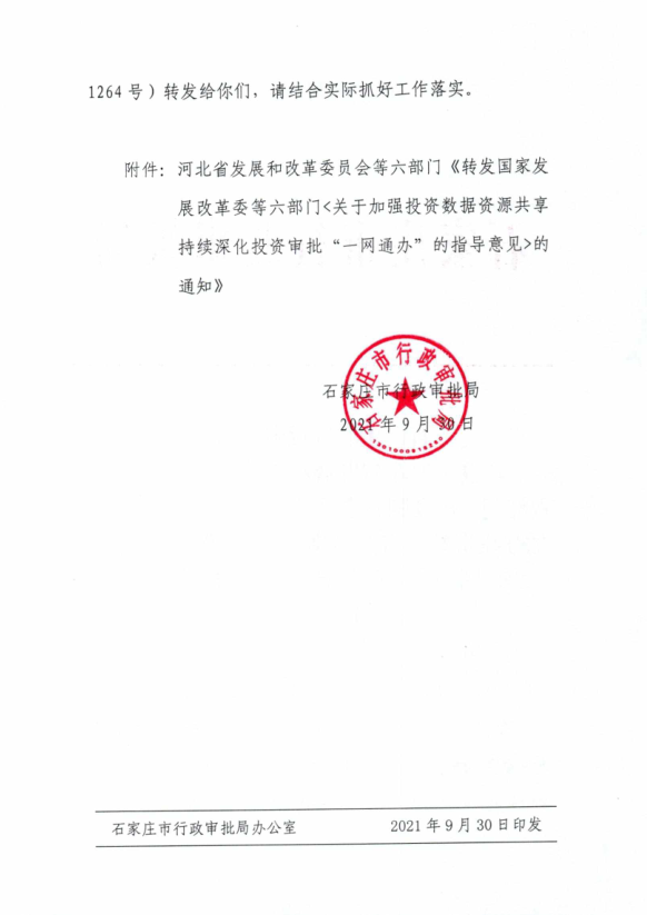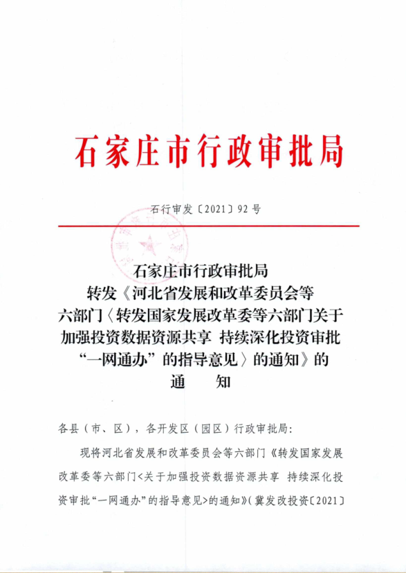 石家庄市行政审批局关于转发《河北省发展和改革委员会等六部门〈转发国家发展改革委等六部门关于加强投资数据资源共享 持续深化投资审批